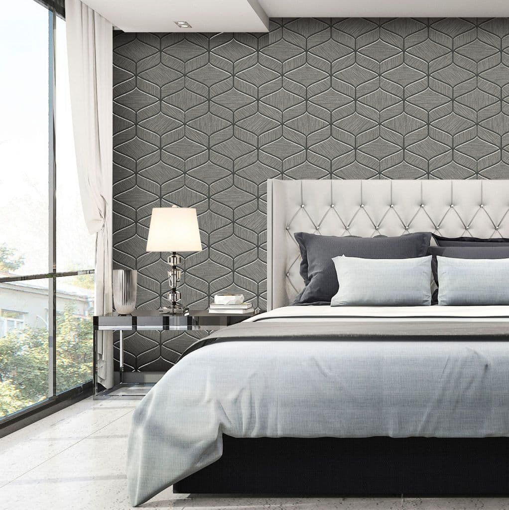This wallpaper features a bold geometric design on a textured background with silver metallic features.